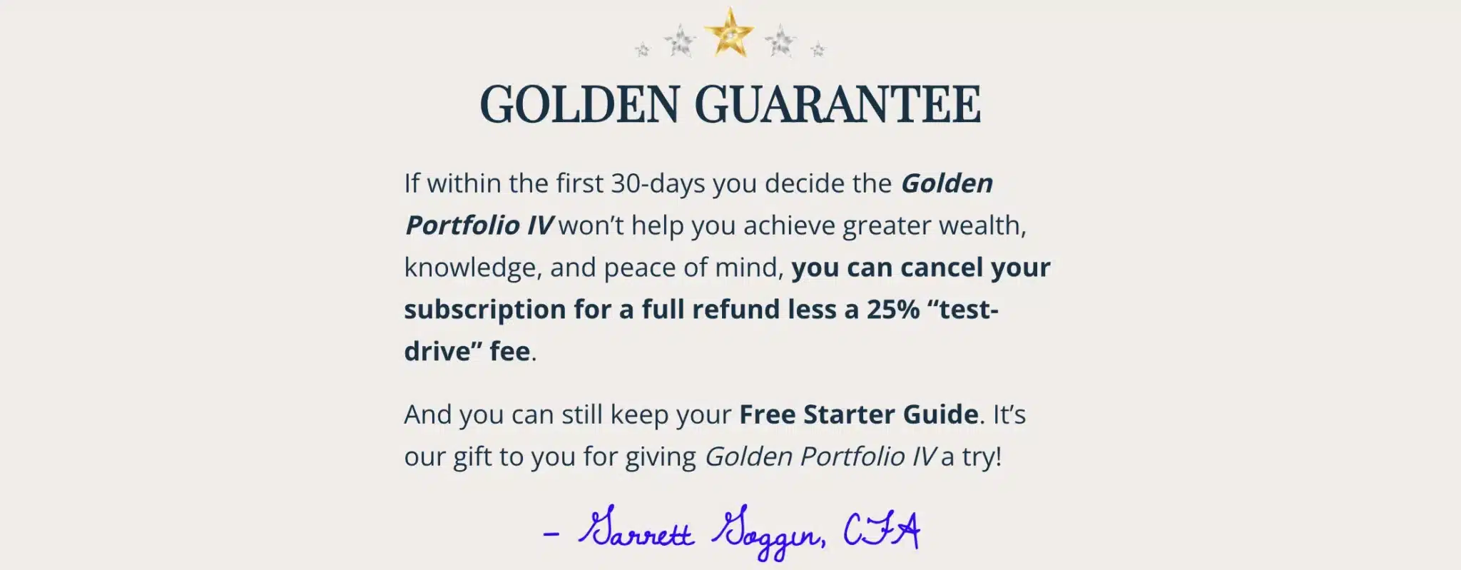 The main component of Golden Portfolio IV is the quarterly research publication written by Garrett Goggin himself.